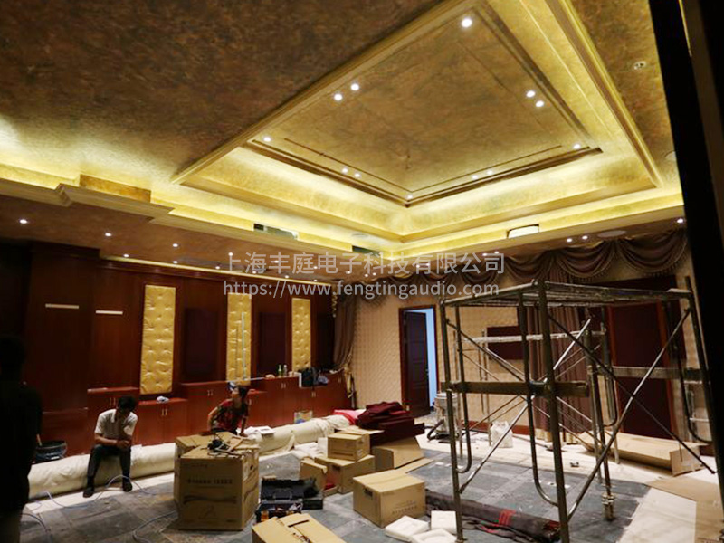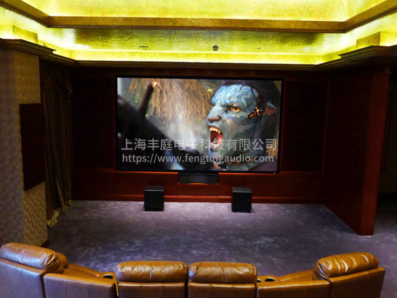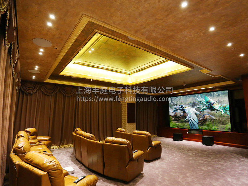 房間的原始層高高度良好,在吊頂深度足夠的前提下,為了手繪油畫裝飾頂面的美觀以及整體協(xié)調(diào)性,投影機選擇了隱藏式安裝。為了得到良好的亮度反饋和實際觀感,選擇了大尺寸熒幕配合高增益幕料。而在保證觀看距離的前提下,前方三個音箱選擇