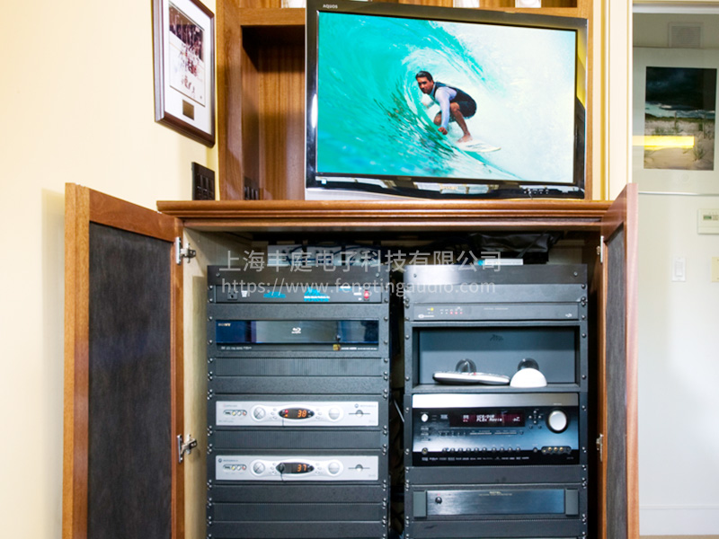 幕布兩邊設(shè)計(jì)了2個(gè)對(duì)稱的柜子,影院控制設(shè)備以及家里面其余背景音樂與音視頻共享設(shè)備等全部放在里面,干凈簡(jiǎn)潔,也方便后期售后與維護(hù)。